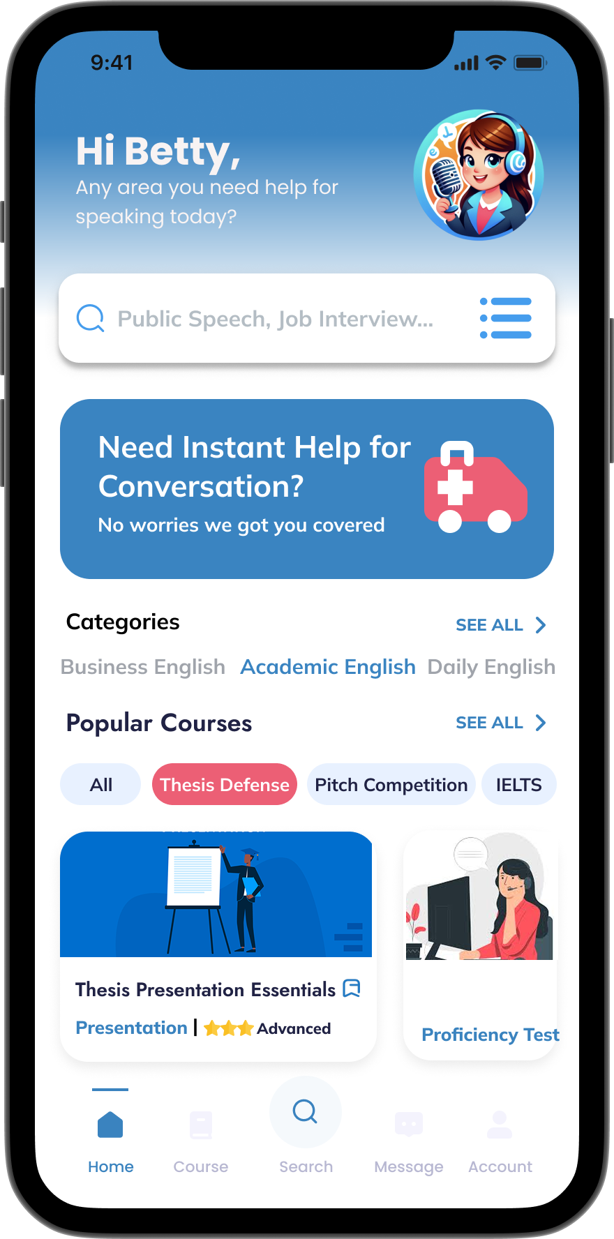 Once signed in, learners see a clear layout that categorizes different learning modules (e.g., Academic, Business, and Casual English). Drawing on Task-Based Language Teaching, these modules focus on practical tasks—like delivering a presentation or explaining medical symptoms. The app’s user-friendly interface, supported by Generative AI, provides a wealth of resources, interactive avatars, and live chat features that allow learners to explore content relevant to their personal or professional contexts.