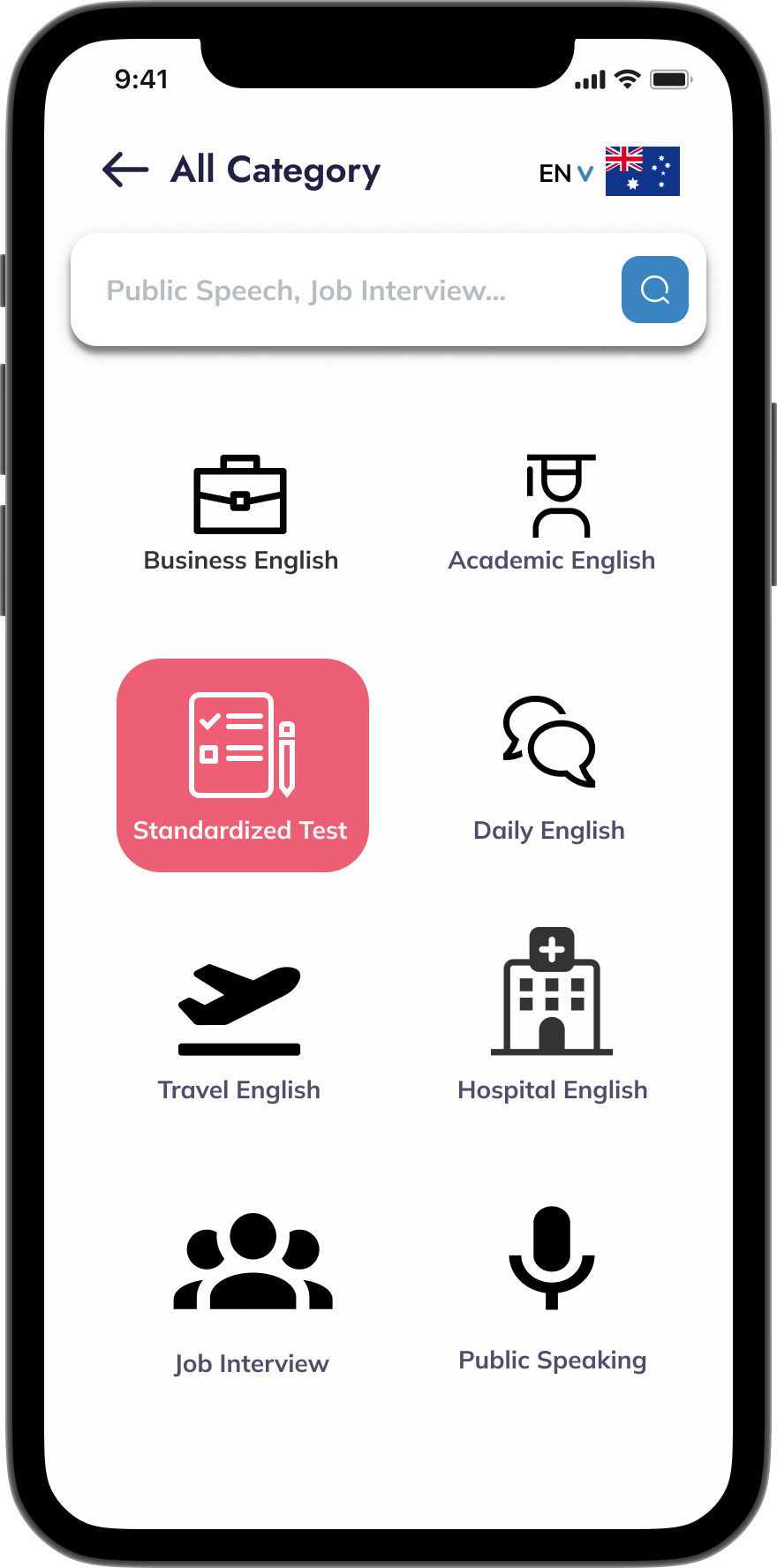 A prominent search bar on this page enables learners to locate modules tailored to specific communication needs—such as job interviews or conference presentations. By typing in keywords, the user is directed to specialized resources, AI-driven practice scenarios, and human tutoring options. This flexible design is aligned with the principle of meaningful output (Swain, 1985), ensuring learners can easily find tasks that match their real-life speaking goals and receive immediate, context-specific support.